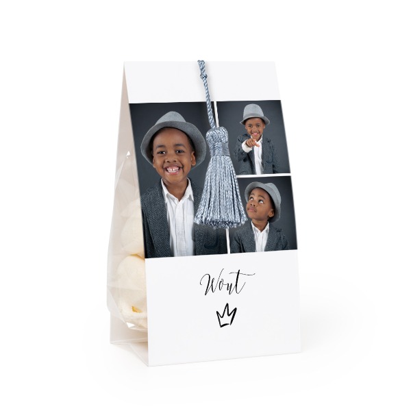 Kies je ontwerp voor Snoepzakje met fotoverpakking en zilverblauw kwastje - Set van 24