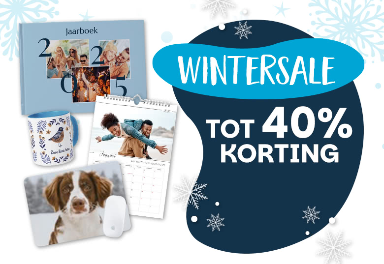 *De actiecode WINTERSALE geeft 30% korting op fotoboeken, 10% korting op fotoafdrukken en fotocadeaus, 25% korting op naamlabels en kaartjes en 40% korting op kalenders. Op wanddecoratie ontvang je 20% korting vanaf 50 euro. De actiecode is niet geldig op extra opties en de verzendkosten. De code kan niet gecombineerd worden met andere acties of actiecodes. Deze actie is geldig van maandag 29 december 2025 t/m zaterdag 31 januari 2026.